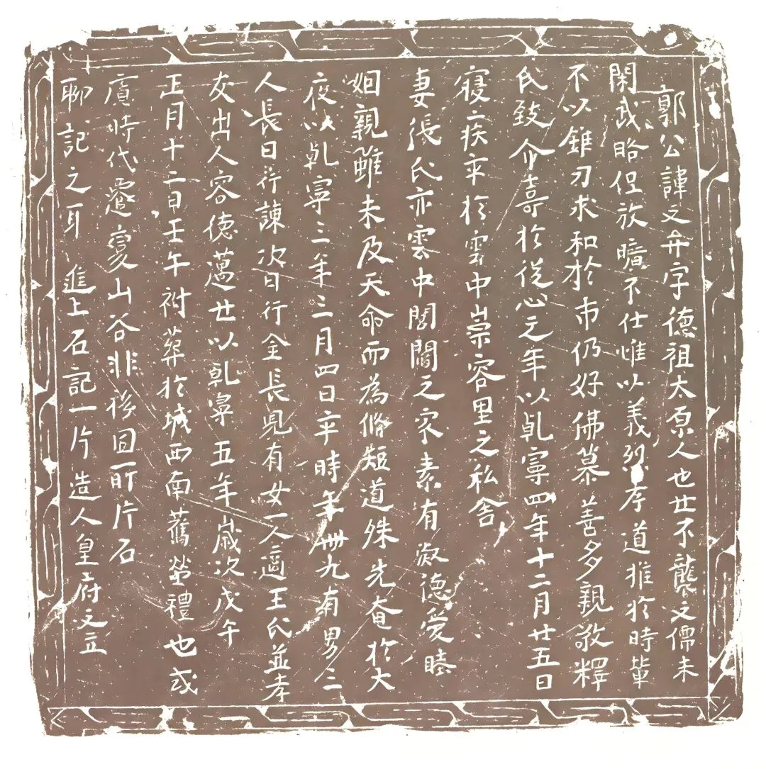 郭公諱文弁,字德祖,太原人也。世不襲文儒,未閑武略,但放曠不仕,惟以義烈、孝道推於時輩,不以錐刃求和於市。仍好佛、慕善,多親敬釋氏,致介壽於從心之年,以乾寧四年十二月廿五日寢疾,卒於雲中崇榮里之私舍。妻張氏,亦云中閭閻之家,素有淑德,愛睦姻親,雖未及天命,而為修短道殊,先奄於大夜,以乾寧三年三月四日卒,時年卌九。有男三人,長曰行諫,次曰行金。長兒有女一人,適王氏,並孝友出人,容德邁世。以乾寧五年歲次戊午正月十二日壬午祔葬於城西南舊塋,禮也。或慮時代遷變,山谷非移,因(原錄文:“固”)所片石,聊記之耳。進上石記一片。造人皇府文立。