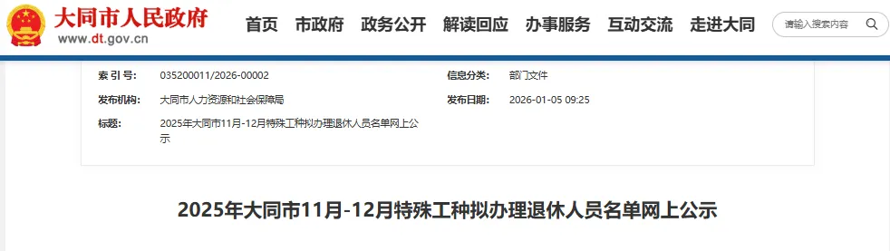 根据山西省人力资源和社会保障厅关于转发人力资源社会保障部《关于进一步加强企业特殊工种提前退休管理工作的通知》的通知精神要求,现对大同市2025年11月-12月特殊工种拟办理退休人员76人进行网上公示。