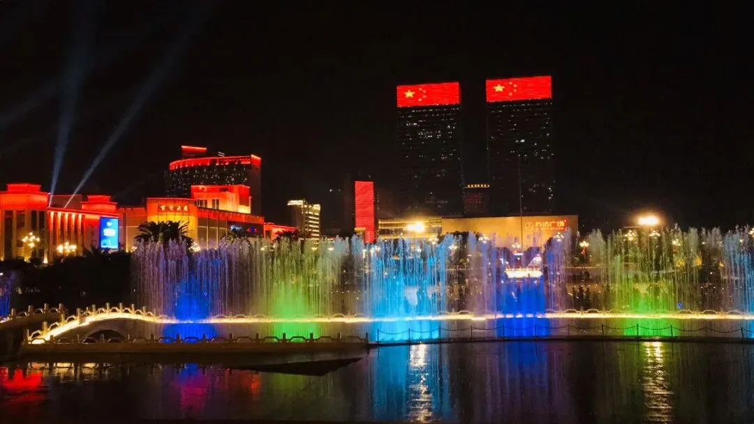 夜晚广场赏喷泉,