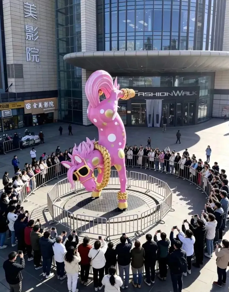就是这座坐落在太原北美新天地商场门口,色彩粉嫩靓丽寓意“马倒成功”的时尚雕塑。