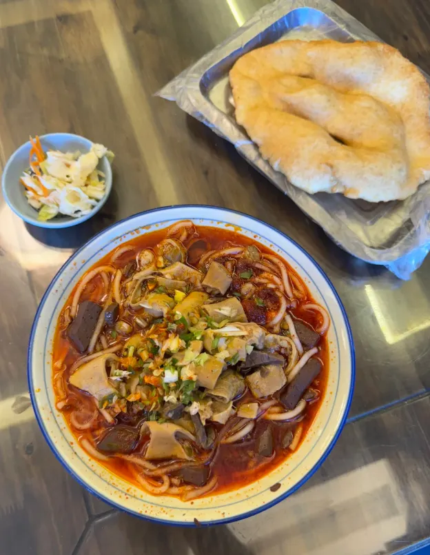 推荐红油羊杂配油饼。羊杂得是大锅熬的,汤色奶白,上面飘着厚厚一层红油。喝一口,辣味不是冲嗓子,而是顺着喉咙往下暖。刚炸出锅的油饼,外皮酥脆,泡在汤里吸满了汁水,一口咬下去,油香和肉香在嘴里炸开,人一下子就醒透了。