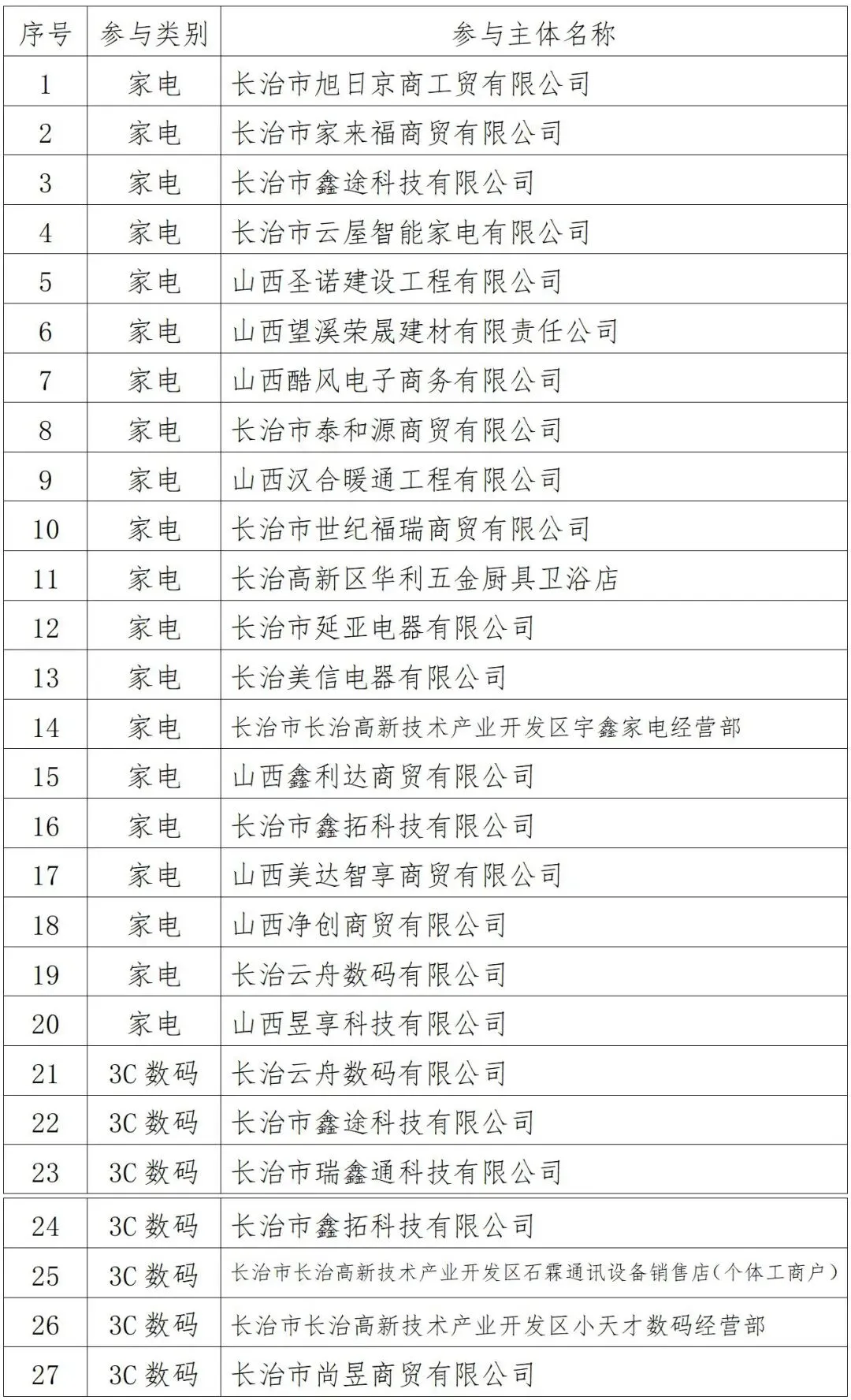 长治高新区2026年家电和3C数码产品以旧换新参与主体预征集(拟)公示