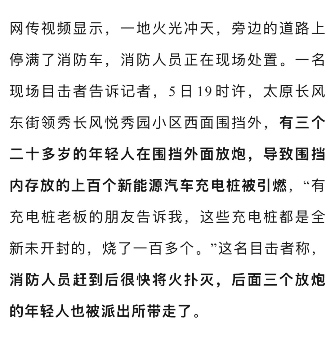 太原多人燃放烟花引燃上百个全新充电桩,应急局工作人员称无人员伤亡,警方:人已经被抓获