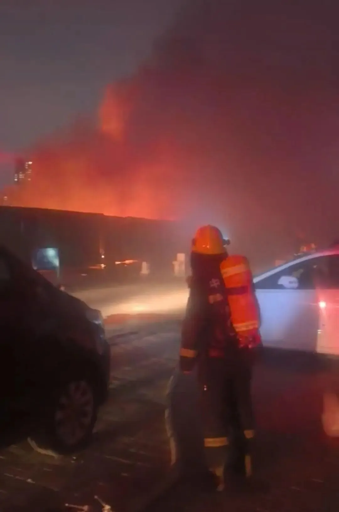 充电桩被引燃后,消防人员立即赶到现场救火(来源:受访者)