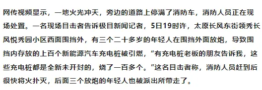 太原燃放烟花引燃上百个全新充电桩,应急局工作人员称无人员伤亡,警方:人已经被抓获