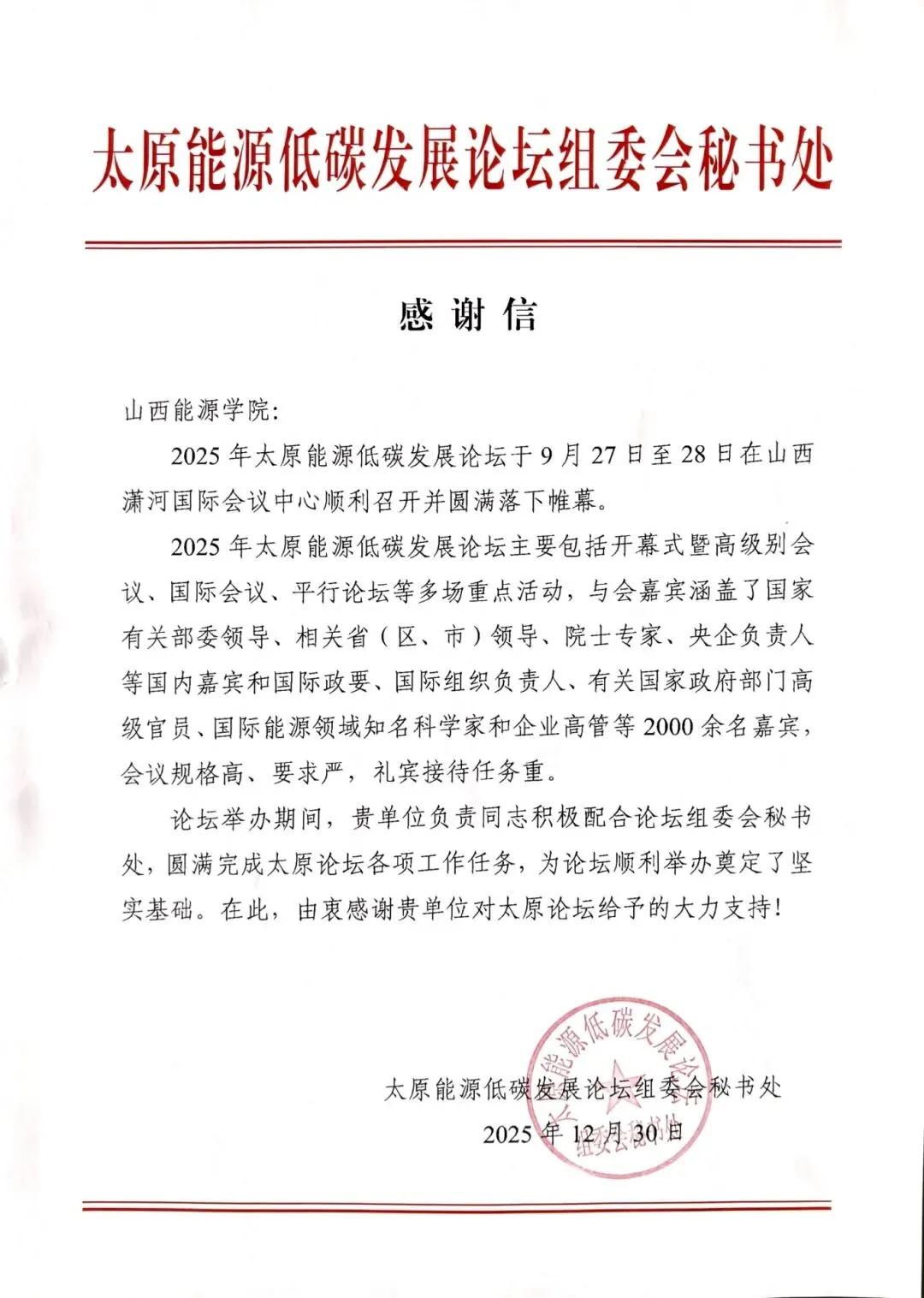 近日,太原能源低碳发展论坛组委会秘书处向我校发来感谢信,对学校在2025年太原能源低碳发展论坛期间的支持表示感谢。