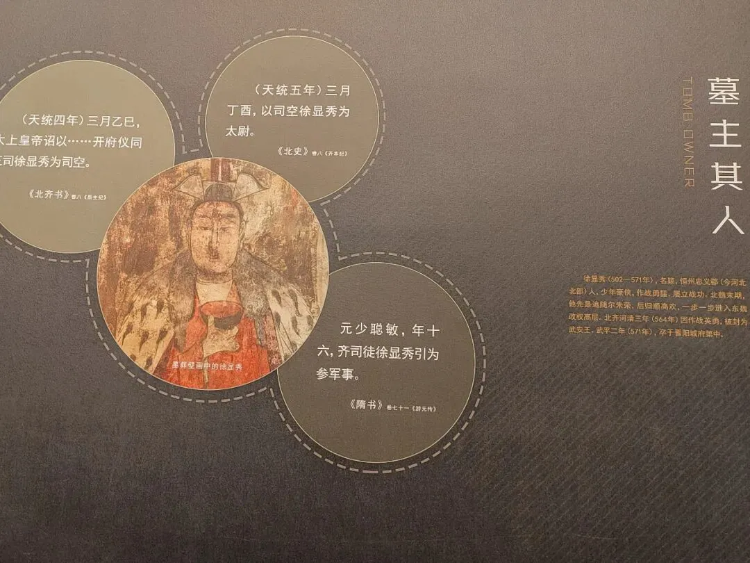 太原北齐壁画博物馆建在北齐武安王徐显秀墓的原址之上。2000年,徐显秀壁画墓重见天日,300余平米的壁画震惊世人。由于作画时没有底板,工匠直接在黄土之上刷白浆,最薄处仅2毫米,无法揭取保护,于是诞生了这座原址之上的博物馆。