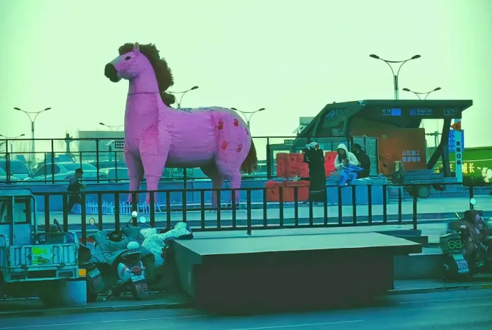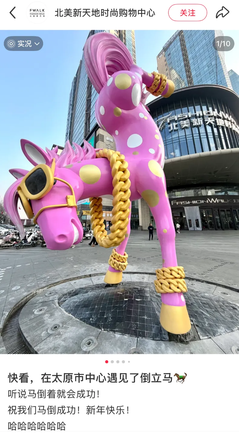 雕塑刚亮相时,确实不负众望地掀起打卡热潮。粉嫩的色彩搭配叛逆的倒立姿态,瞬间戳中年轻人的审美,短视频平台上相关内容刷屏,商场门前一度排起拍照长队。商场的初衷很明确:2026年是农历马年,"马倒"谐音"马到",既讨新年彩头,又能靠新奇造型引流,堪称商业营销的常规操作。可谁也没预料到,太原方言成了这场创意营销的"拦路虎"。