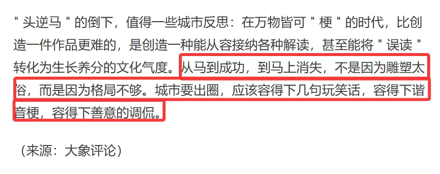也有媒体认为:从马到成功,到马上消失,不是因为雕塑太俗,而是因为格局不够。