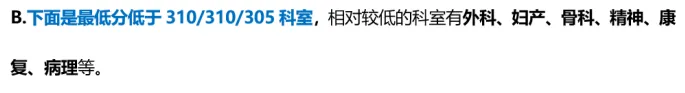 B.下面是最低分低于300/310/300科室,最低分相对较低的科室有妇产、骨科、外科、康复、临床病理等。