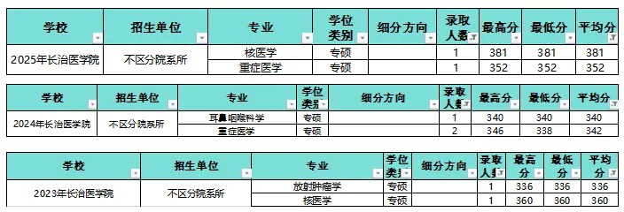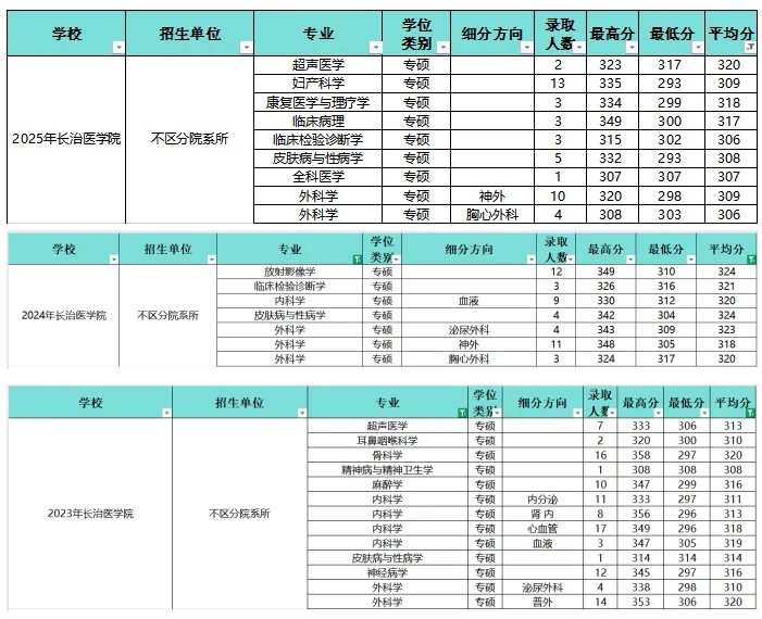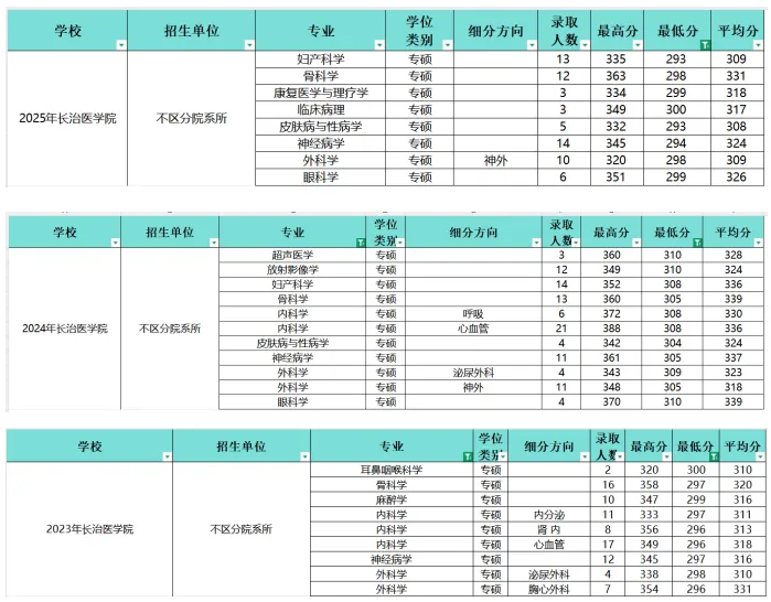 下面是近三年平均分高于340/340/335的科室。可以看出,比较热门高分的科室有内外科、麻醉学、重症等。虽然它们平均分虽然比较高,但是大部分最低分不算高,还是能报的。