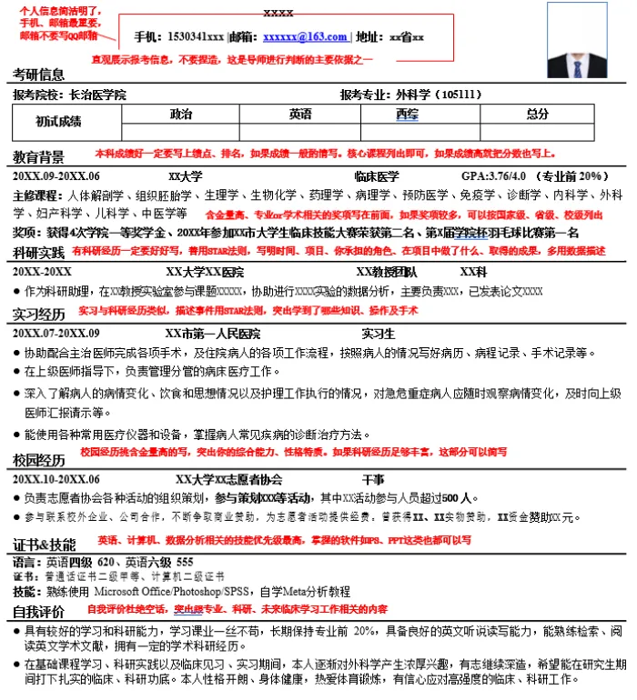 最有亮点、相关性最高的信息要放在简历最显眼的地方,建议重点突出英语、科研相关内容,科研实在没有的可以写毕设,写本科做过的实验以及掌握的实验技能、数据处理技能,专硕可以写实习轮转过的科室和学到的临床技能。