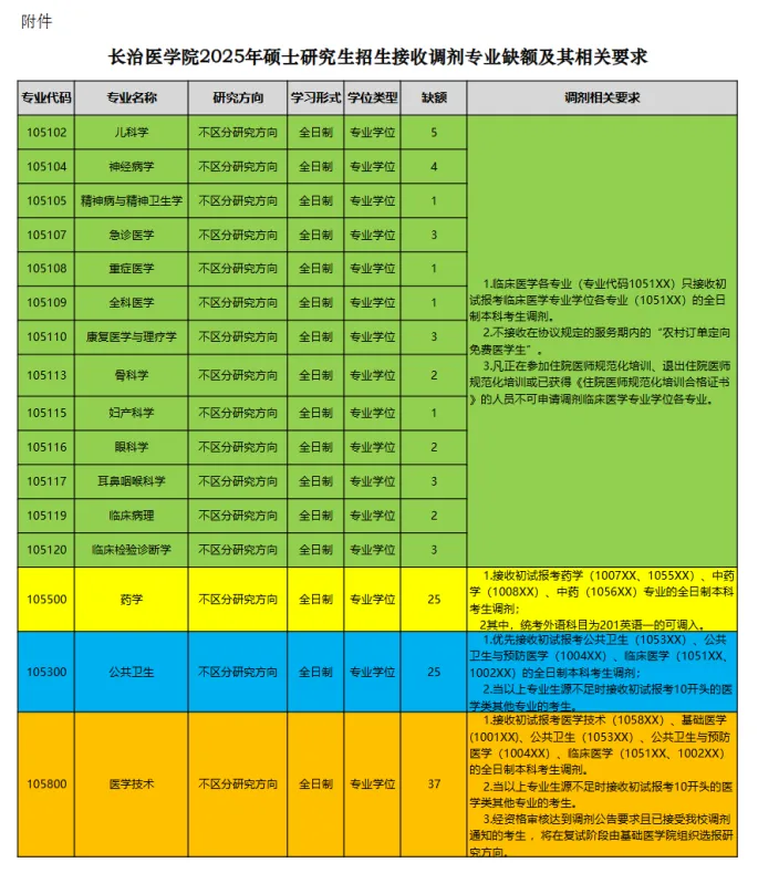具体名额见调剂名额附录。长治医学院2025年专硕调剂名额有31个,可以看出主要集中在儿科学、神经病学、急诊医学等专业,这些专业名额普遍在3人及以上,其他临床专硕也有零星调剂名额。
