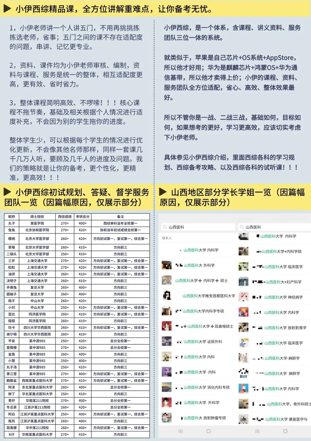 本校定向考研辅导,市面上目前为止,仅此一家!!!跟着我们,你会发现,原来西综学习,是有方法,有路径,有底气,有希望的。具体参见小伊西综介绍,里面西综各科的学习规划、西综备考攻略、以及西综各科的试听课!!!全科班还提供名师公共课与服务,助您备考无忧!!!