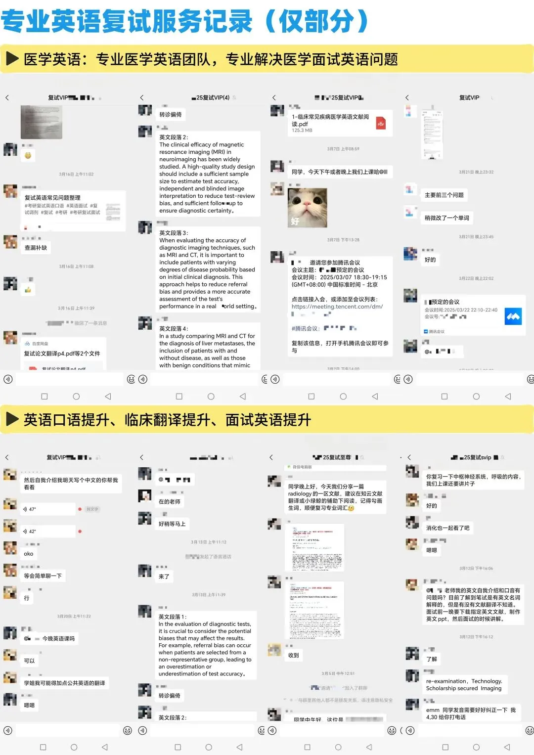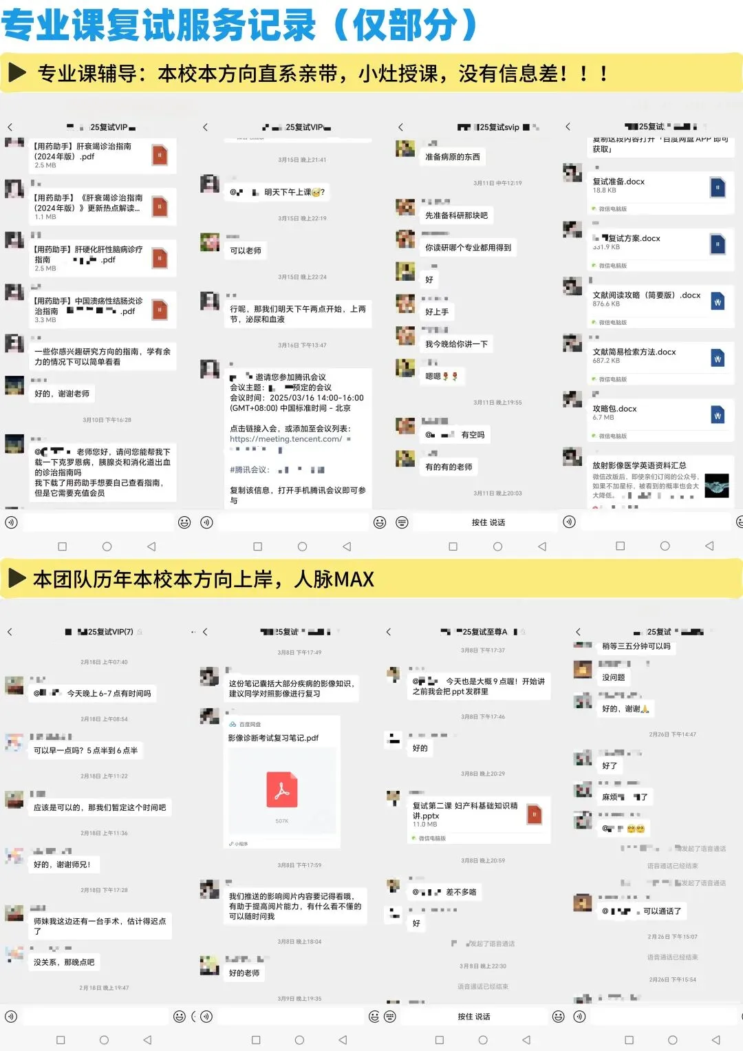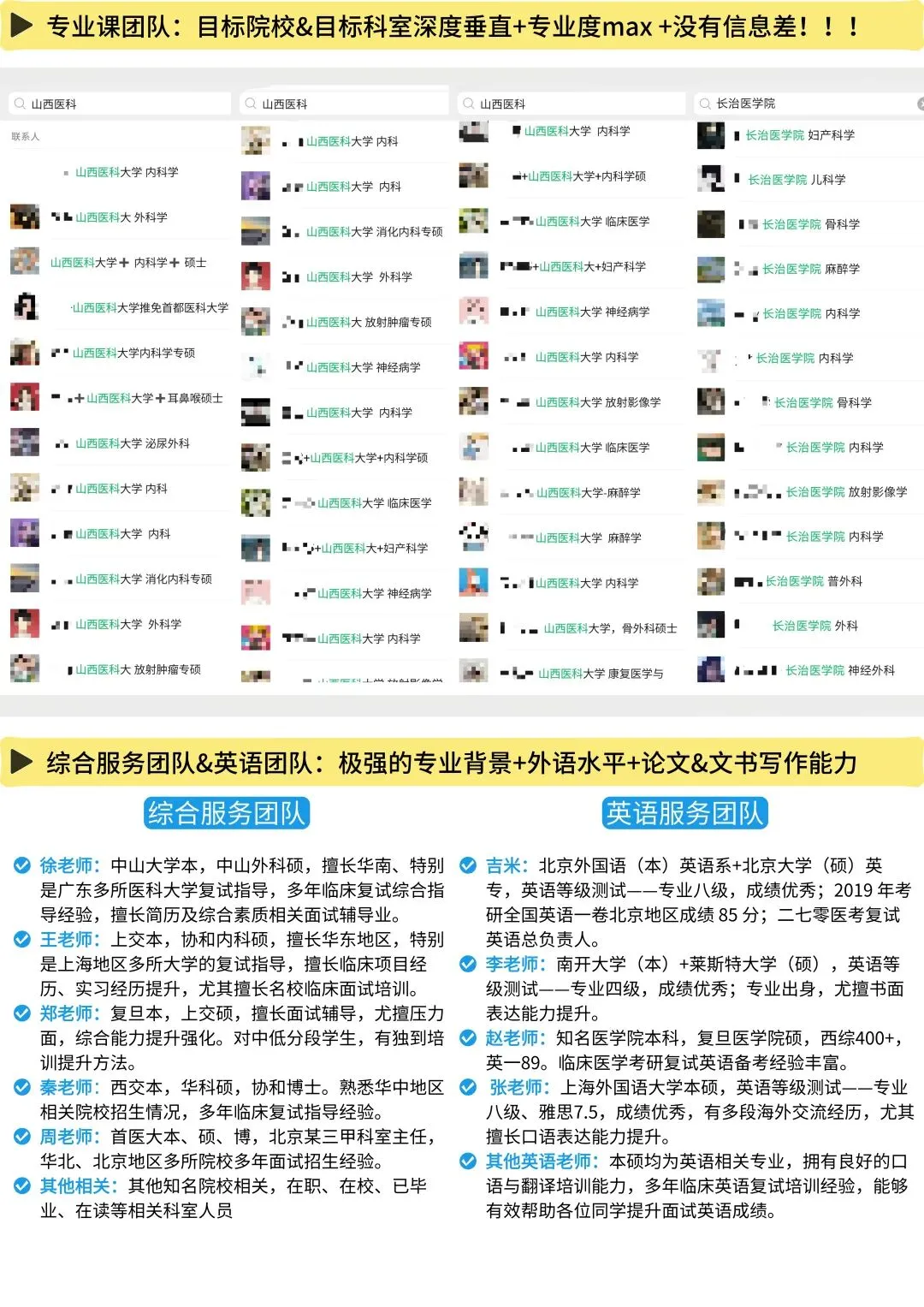 本校各个科室、各个医院,几乎都有我们各个团队的初试、复试录取学员、团队服务成员,没有什么打听不到的,所有关于本校初试、复试的相关问题,通通解决。你们可以看一下我们的通讯录截图,看一下我们资料页截图,然后看一下我们关于复试的,各项带学生的服务记录,你会发现,做本校考研初复试的团队,比我们专业的,几乎没有!!!
