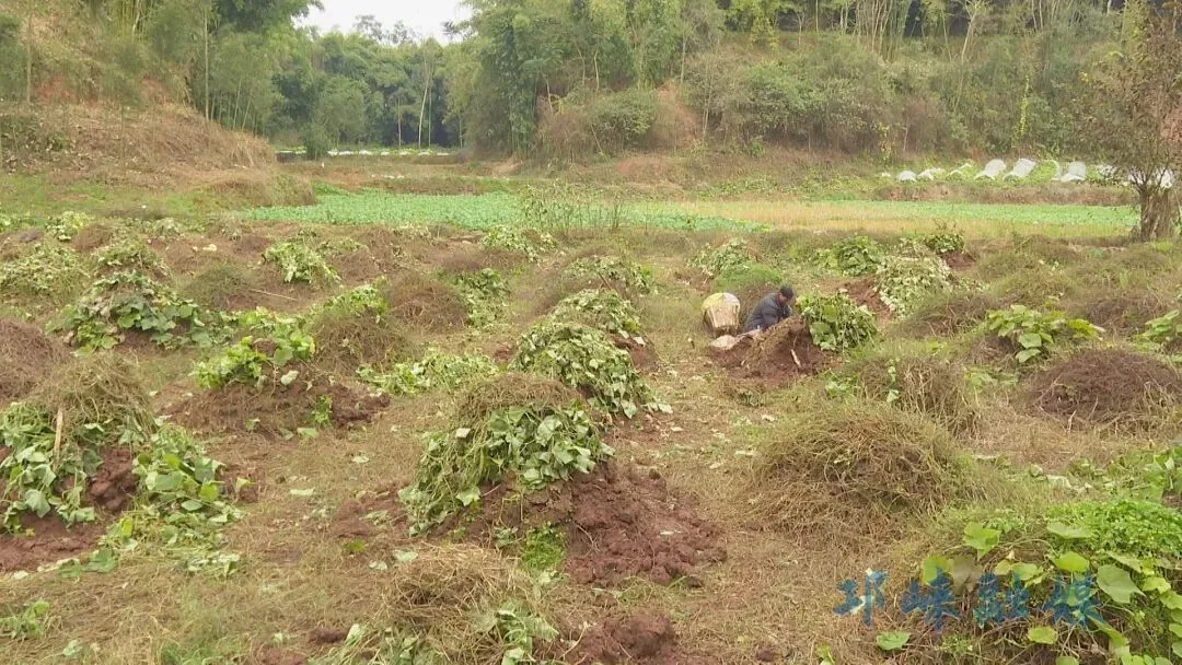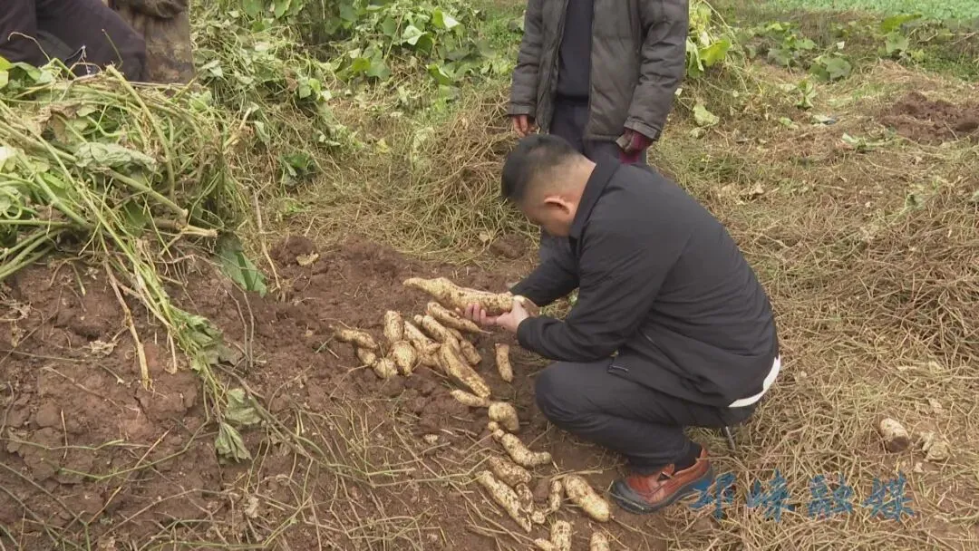 1月7日,记者在钟山社区看到,绿油油的藤蔓覆盖土垄,种植户孙全兴正忙着采收。他脚下50余亩基地中,饱满的根茎深藏土中,一派丰收景象。