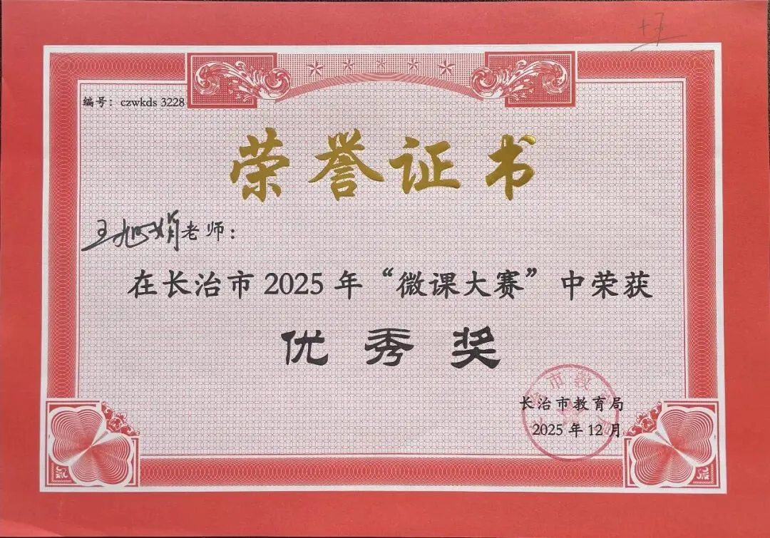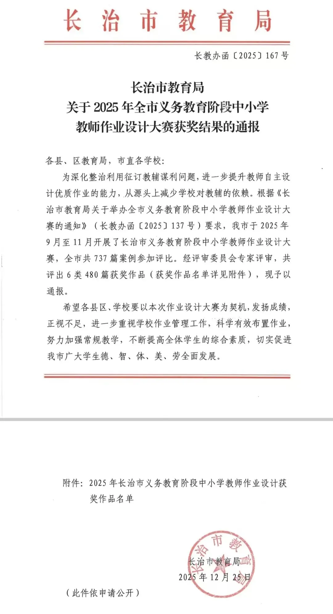 在长治市义务教育阶段作业设计比赛中,我校教师积极参与、精心构思,选送的作品展现出扎实的专业素养与优秀的作业设计能力。最终,我校共有7项作品脱颖而出。