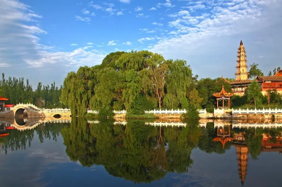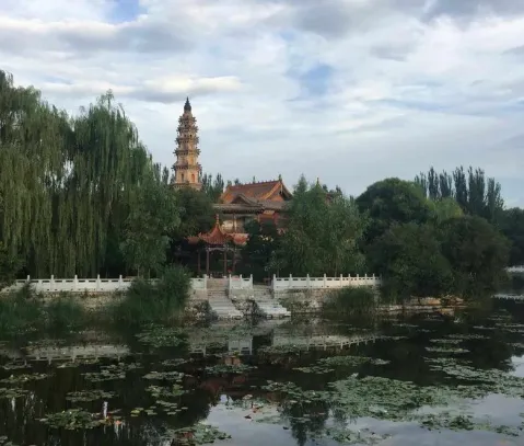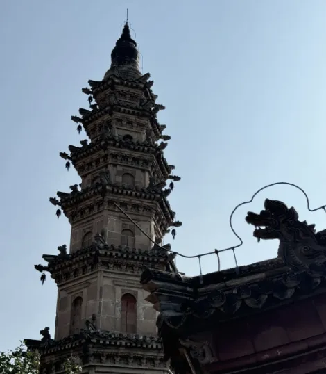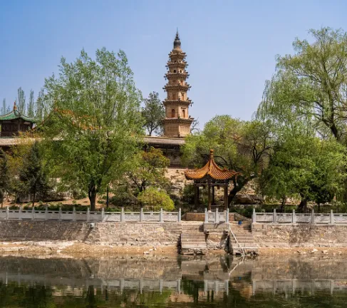 1911年地震时,塔刹覆钵以上部分坠入壶山泉池,如今的相轮、宝珠与刹杆为后期补配,即便如此,这座雁北清代砖塔的代表之作,仍以精巧朴实的砖雕工艺令人赞叹。登塔远眺,整座壶泉湖全景尽收眼底,湖畔柳丝轻拂,湖中碧波荡漾,广灵县城的烟火市井与田园风光交织成画,尽显“塞北小蓬莱”的独特韵味。