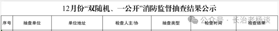 为确保火灾形势持续平稳,全面推行“双随机、一公开”消防监督管理模式。长治市消防救援支队根据年度抽查计划和进度,在2025年12月份对全市消防安全重点单位和非消防安全重点单位进行了监督抽查,现将12月份“双随机、一公开”消防监督抽查结果公示如下: