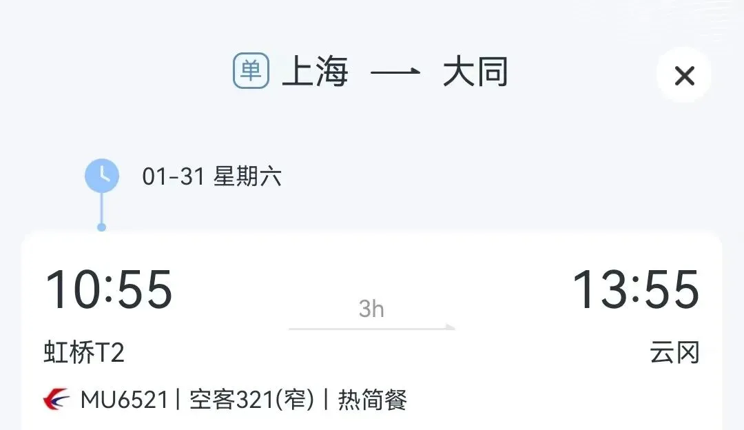 此次加密大同直飞上海虹桥航班执行日期为1月31日至3月5日,每日一班。航班具体起降时刻为:大同(14:45)—上海虹桥(17:30)、上海虹桥(10:55)—大同(13:55),航班号为MU6521/2。