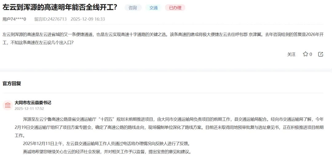 >大同这条高速明年能否全线开工?官方回复!