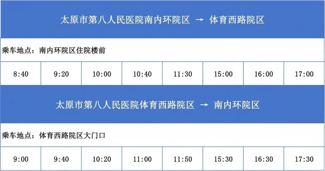 近日,太原市第八人民医院现已开通免费接驳车,优化南内环院区和体育西路院区之间运行的班车时刻表,进一步缩短患者跨院区就诊的候车时间,提升就医便利度。