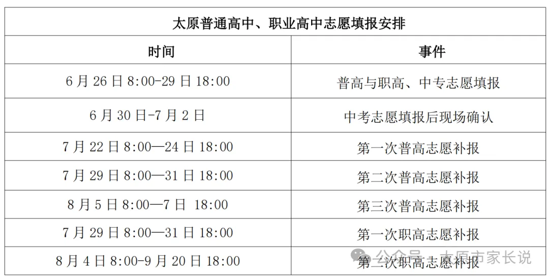 6月26日8∶00至29日18∶00,考生登录“山西招生考试网”(网址:http://www.sxkszx.cn),进入“山西省中考考生网上服务平台”填报普通高中学校和职业高中学校志愿。【普高志愿补报】普通高中学校预计进行三次志愿补报(补报志愿次数根据学校缺额确定,无缺额不补报)。届时将公布未完成招生计划的学校和缺额,未被录取的考生可登录“山西招生考试网”补报志愿。补报志愿不再进行现场确认,以网报信息为准。