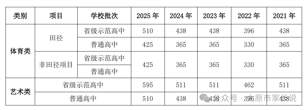 体育类:省级示范高中文化线510分,其他高中425分;专业成绩≥60分且专项≥50分(百分制);专项100分可降文化线100分,专项≥90分可降50分。