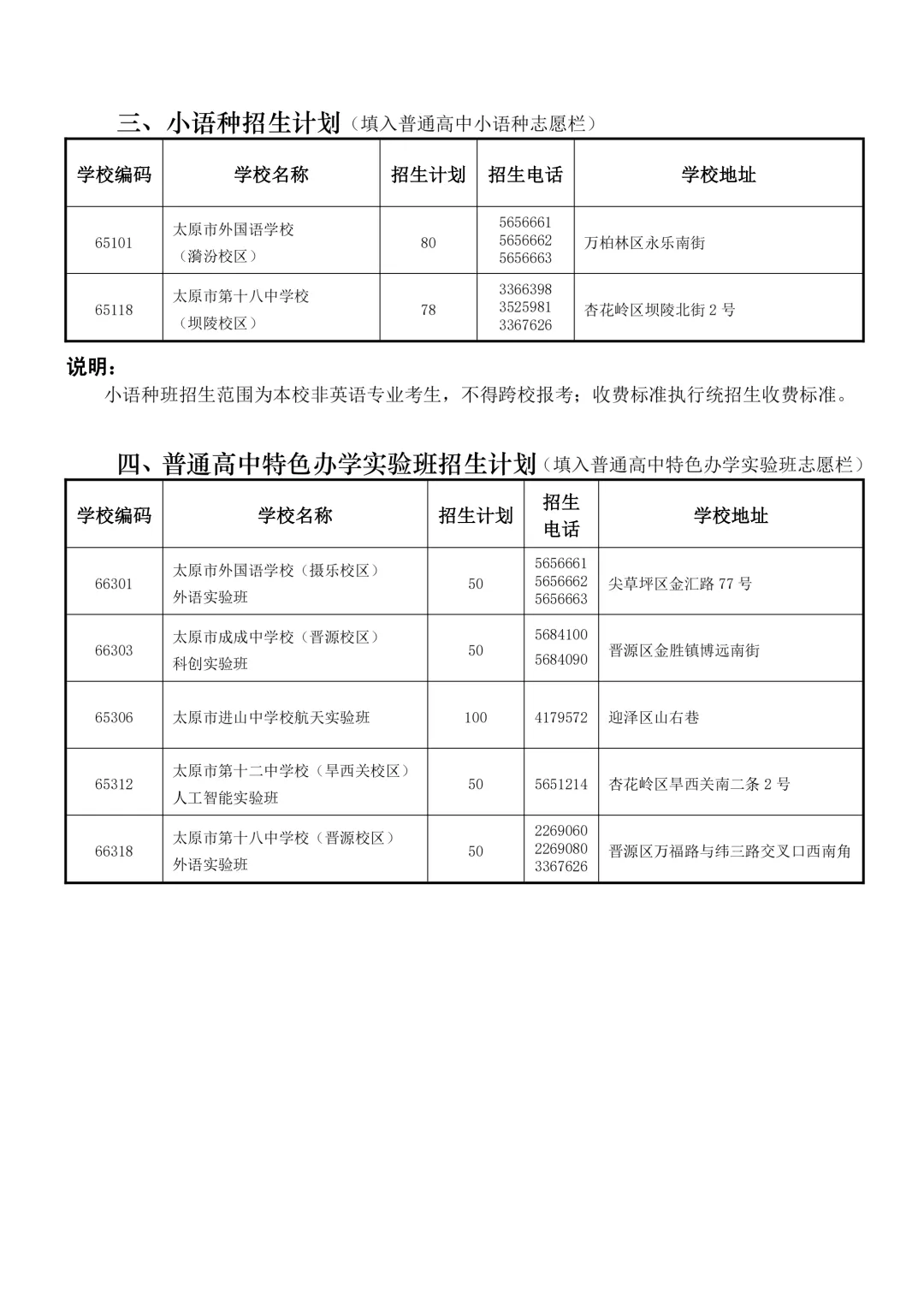 普通高中学校特色办学实验班分别为:太原市进山中学校航天实验班;太原市第十二中学校( 旱西关校区)人工智能实验班;太原市外国语学校(摄乐校区)外语实验班;太原市第十八中学校 (晋源校区)外语实验班;太原市成成中学校(晋源校区)科创实验班。该志愿栏共设一个志愿, 考生可以在五所学校的特色办学实验班中选择一所填报。普通高中学校特色办学实验班面向全市招 生,本市户籍考生和进城务工人员随迁子女享受同等待遇的应届考生均可填报。