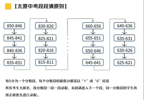 普通高中录取不分批次,实行分段录取(段段清):从850分起每5分为一个分数段,在每个分数段内按志愿顺序投档;同分依次比较语文—数学—外语—理科综合—文科综合单科成绩。普通高中最低录取控制线:615分。