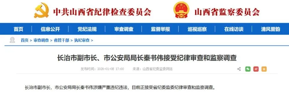 据山西省纪委监委网站1月8日消息,长治市副市长、市公安局局长秦书伟涉嫌严重违纪违法,目前正接受省纪委监委纪律审查和监察调查。