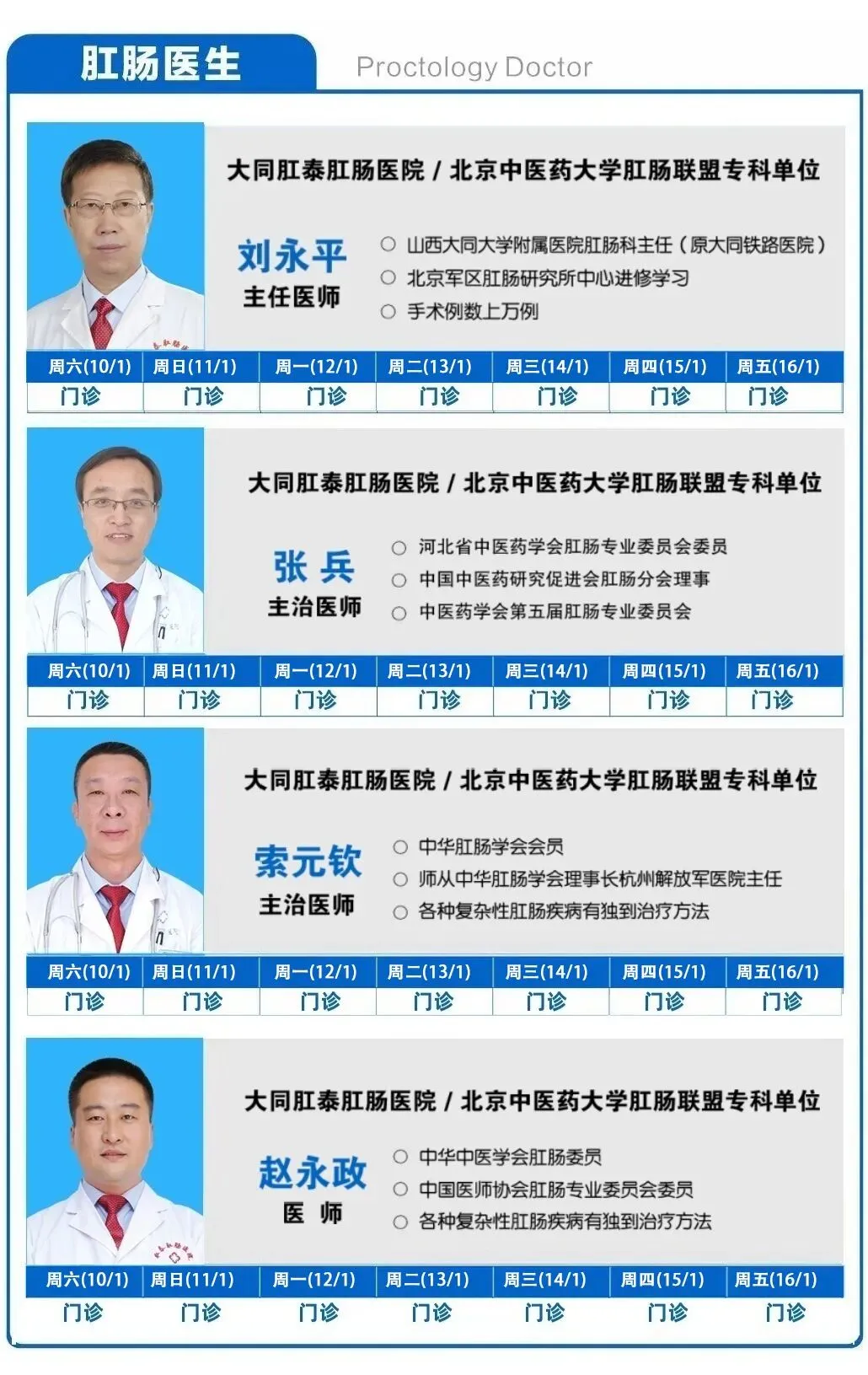 大同肛泰肛肠医院1月10日—1月16日专家排班