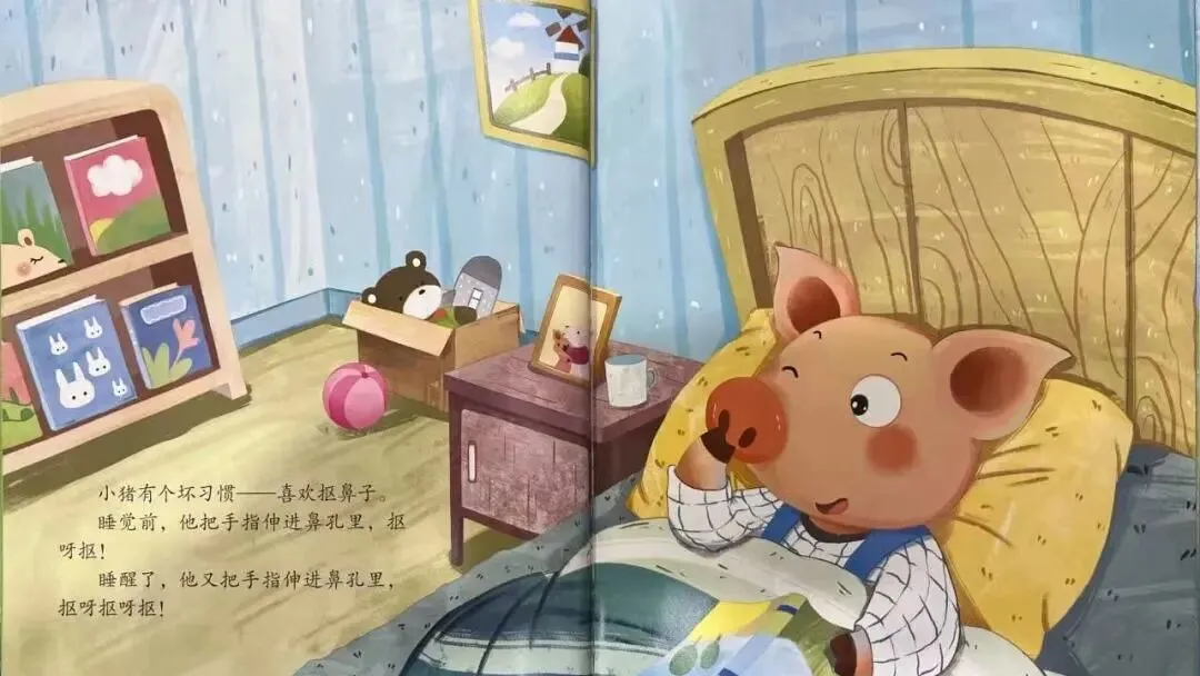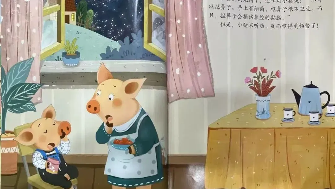 小猪妈妈见到了,连忙对小猪说:"不可以抠鼻子。手上有细菌,抠鼻子很不卫生。而且,抠鼻子会损伤鼻腔的黏膜。"
