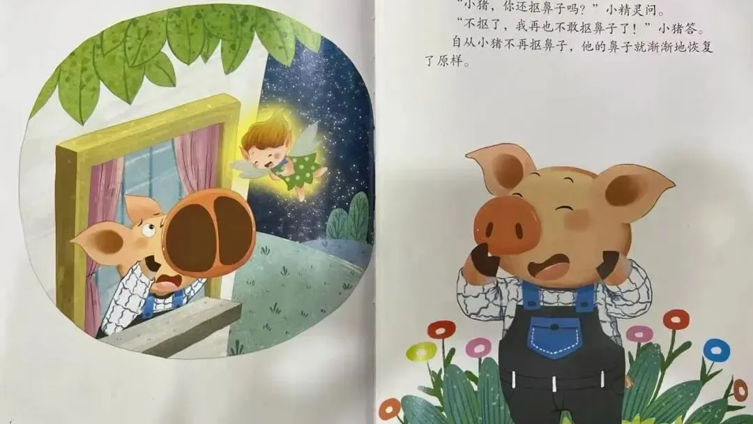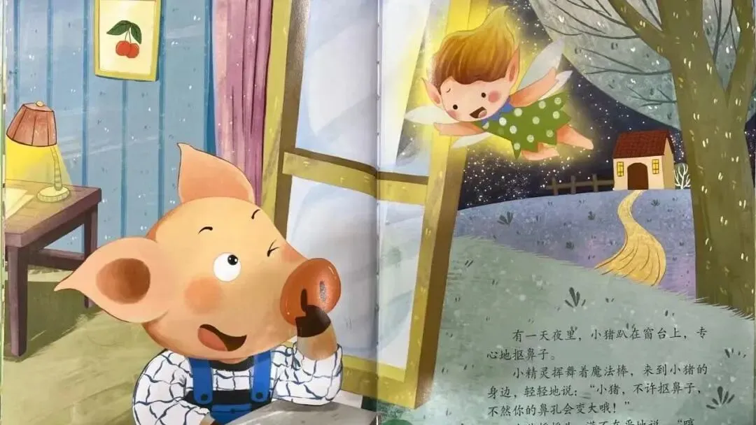 小精灵挥舞着魔法棒,来到小猪的身边,轻轻地说:"小猪,不许抠鼻子,不然你的鼻孔会变大哦!"