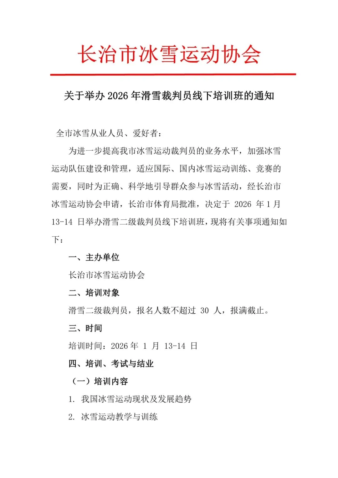 长治市冰雪运动协会2026年滑雪裁判培训通知