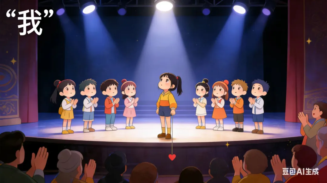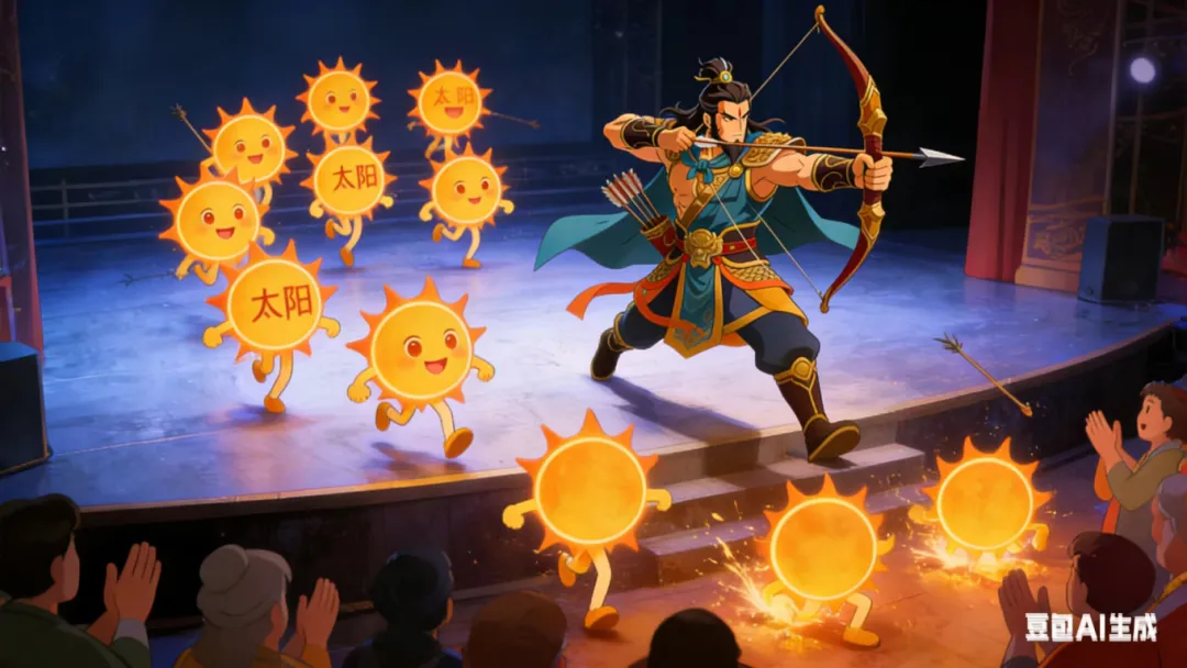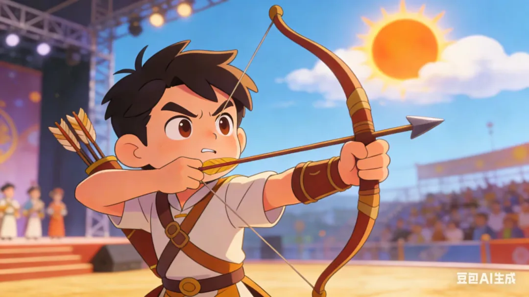 紧接着,《后羿射日》的音乐响起,大家的心瞬间揪紧。十个“太阳”蹦跳着涌上台,仿佛把教室“烤”得热气腾腾,台下的我们纷纷假装扇风,齐声喊着“好热呀”!就在“老百姓”即将被晒得难以支撑的危急时刻,神箭手后羿大步流星冲上舞台,拉弓搭箭“嗖嗖嗖”,九个“太阳”应声落下。全场瞬间沸腾!家长们拍手连声赞叹:“哇塞,太精彩了!”我们的掌声更是像炒豆子一般,噼里啪啦响个不停,哪怕手掌拍红了,也舍不得停下。