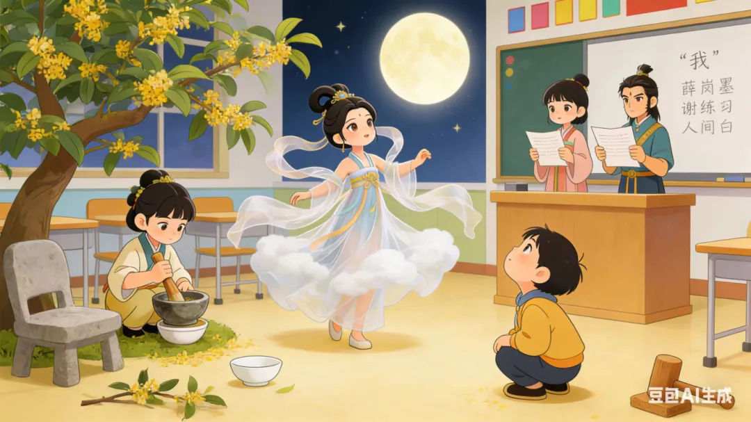 同学们的装扮更是五花八门:有人化身娇美温婉的娥皇女英,裙摆轻扬,宛若仙女下凡;有人扮成威风凛凛的后羿,手持“弓箭”伫立台前,帅气的模样引得大家忍不住小声惊呼。