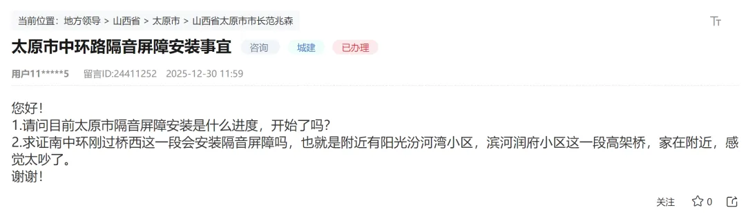 2025年6月,太原市官方发布的一则招标公告显示:太原的中环线将迎来声屏障项目工程。招标项目为在现状西中环、东中环、南中环、北中环高架桥增设声屏障交通设施(声屏障高3.5m),全长15079.2m。其中,西中环高架桥增设声屏障共长4772m,南中环高架桥增设声屏障共长4936.5m,东中环高架桥增设声屏障共长 3778.7m,北中环增设声屏障共长1592m。建设内容包含桥梁交通设施工程等。项目总投资约4941.82万元。并在随后太原交警发布消息:为提升城市道路交通环境,降低车辆噪音对人民群众的影响,根据市政府安排,将于2025年10月18日至12月31日(23时至次日6时)对中环线(东、南、西、北环线)部分路段分阶段、分时间进行声屏障安装施工,根据《中华人民共和国道路交通安全法》第三十九条的规定,在施工期间将封闭施工路段最右侧一条机动车道(含辅路、匝道)供施工车辆作业使用。届时,请广大驾驶人注意观察交通标志、标识变化,自觉遵守交通规则,服从现场工作人员指挥,安全、有序通行。直到近日,有网友在领导留言板就这项工程发起了咨询: