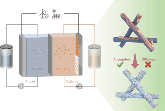 溴基液流电池凭借其较高的氧化还原电位、活性物质资源丰富及成本优势,被广泛认为是面向大规模储能的极具潜力的技术路线。然而,其实际应用仍长期受制于两大核心瓶颈:一方面,Br2/Br-氧化还原反应动力学迟缓,导致高倍率条件下极化严重、能量效率受限;另一方面,多溴化物在电解液中的扩散与跨膜迁移引发显著自放电和活性物质损失,严重削弱循环稳定性。传统研究多依赖溴络合剂或单一电极改性手段加以缓解,但往往以牺牲反应动力学或体系稳定性为代价。因此,如何在抑制溴穿梭的同时协同提升反应动力学,成为推动溴基液流电池走向高效率与长寿命的关键突破口。