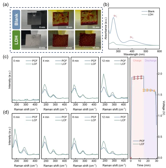 图2. 电极表面对溴物种的吸附能力及其在电化学反应过程中的演化行为。(a) 充电过程中,Blank与LDH样品对应的Pt电极表面形成的多溴物种的光学照片;(b) Blank与LDH电极浸泡后溴溶液的UV-Vis吸收光谱;(c, d) 锌溴液流电池中不同正极在 (c) 充电与 (d) 放电过程中不同时刻的拉曼光谱。