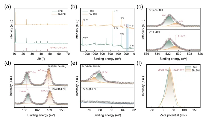 图3. LDH与Bi-LDH的结构及表面性质表征。(a) XRD衍射图谱;(b) XPS全谱图及 (c) O 1s高分辨谱;(d) Bi-LDH与Bi-LDH-Brn-样品的Bi 4f谱和(e) Br 3d谱;(f) Zeta电位测试结果。
