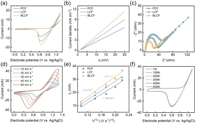 图4. PCF、LCF 与 BLCF 的电化学性能对比。(a) 扫描速率为10 mV s-1时的循环伏安(CV)曲线;(b) 扫描速率为1 mV s-1时的线性扫描伏安(LSV)曲线;(c) 交流阻抗Nyquist图;(d) 不同扫描速率下BLCF的CV曲线;(e) 阴极峰电流(Ic)与扫描速率平方根(v1/2)之间的线性关系;(f) BLCF在连续500次CV循环过程中的电化学稳定性。