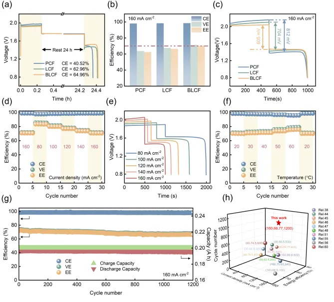图5. 采用不同电极的锌溴液流电池(ZBFBs)性能对比。(a) 在80 mA cm-2下不同正极的自放电性能;(b) 在160 mA cm-2下不同正极的库仑效率、电压效率和能量效率;(c) 在160 mA cm-2下不同正极的充放电曲线;(d) 不同电流密度下BLCF的效率表现;(e) 不同电流密度下BLCF对应的充放电曲线;(f) 不同温度条件下BLCF的效率变化;(g) 在160 mA cm-2下BLCF的循环稳定性;(h) 已报道锌溴液流电池在电流密度、能量效率和循环寿命方面的性能对比。