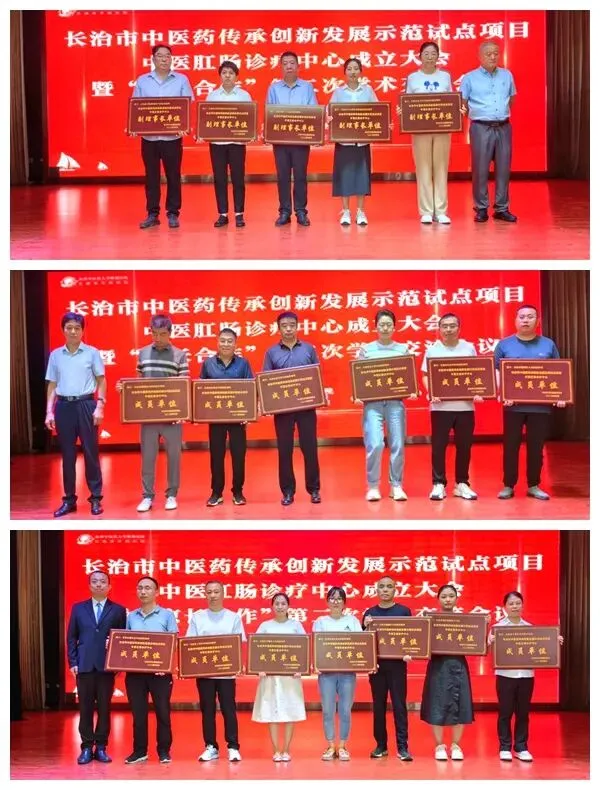 会上,与会嘉宾分别为长治医学院附属和平医院胃肠科、长治医学院附属和济医院胃肠科、长治市第二人民医院胃肠科、长治市中医研究所附属医院肛肠科、长治市北大医疗潞安医院胃肠科等5家中医肛肠诊疗中心副理事长单位的代表和黎城县中医院肛肠科、沁源县中医院肛肠科、壶关县中医院肛肠科等13家中医肛肠诊疗中心成员单位的代表授牌。长治市中医肛肠诊疗中心主任、长治市中医肛肠诊疗中心副理事长单位和成员单位代表分别作表态发言。