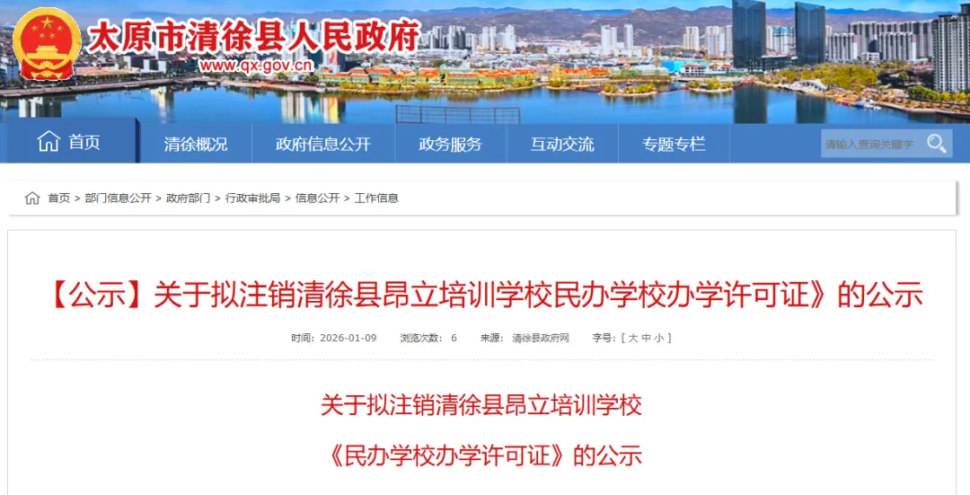 清徐县新天地培训学校于2026年1月8日主动向我局提交了民办学校终止办学的申请。根据《中华人民共和国行政许可法》、《中华人民共和国民办教育促进法》和《中华人民共和国民办教育促进法实施条例》等相关规定,拟同意终止其办学资格并依法注销该校的《民办学校办学许可证》,现公示如下: