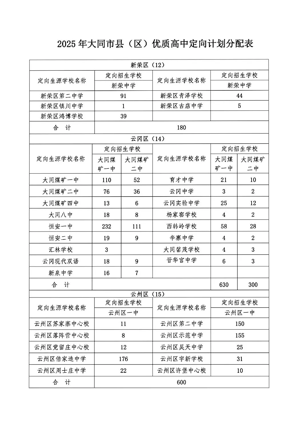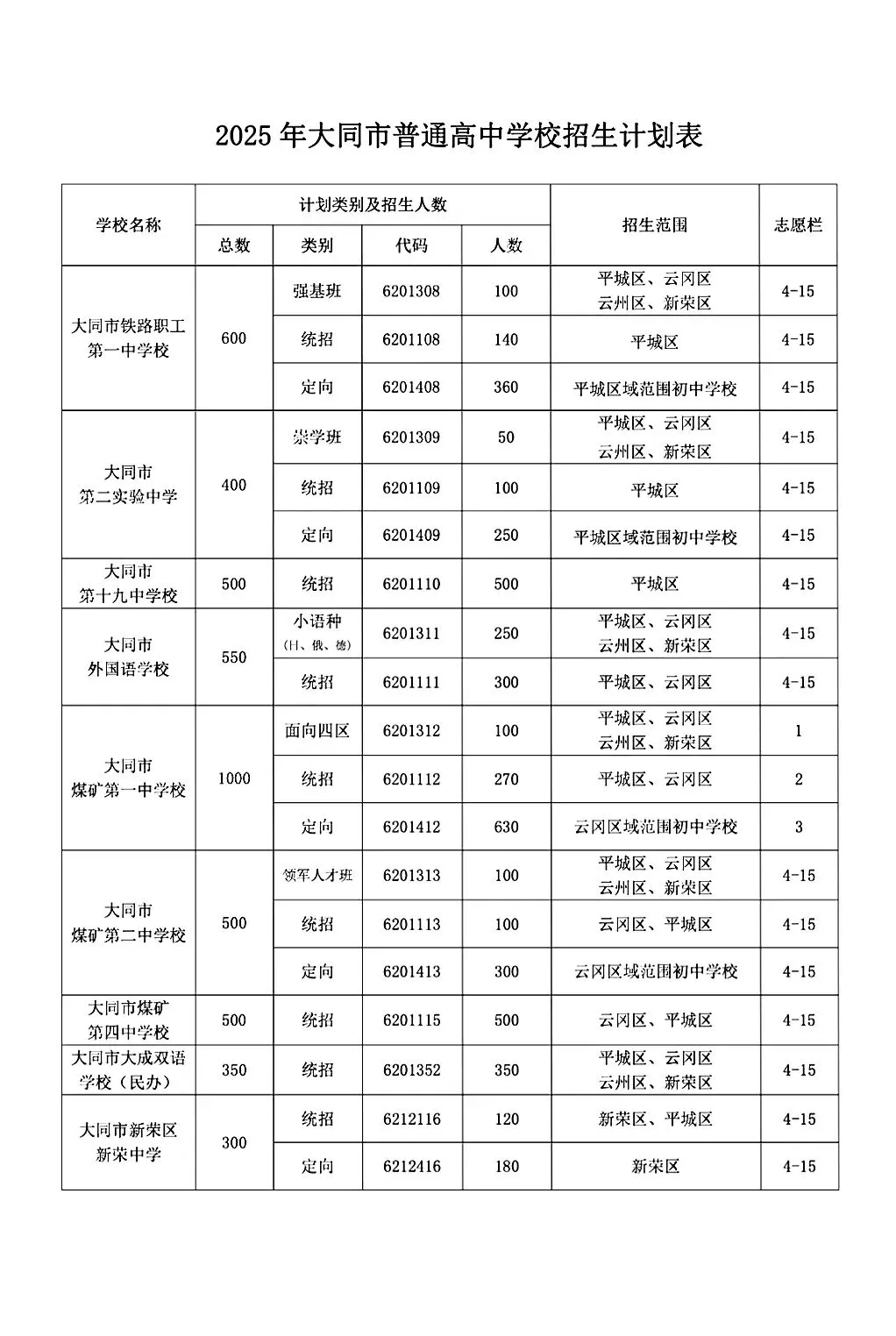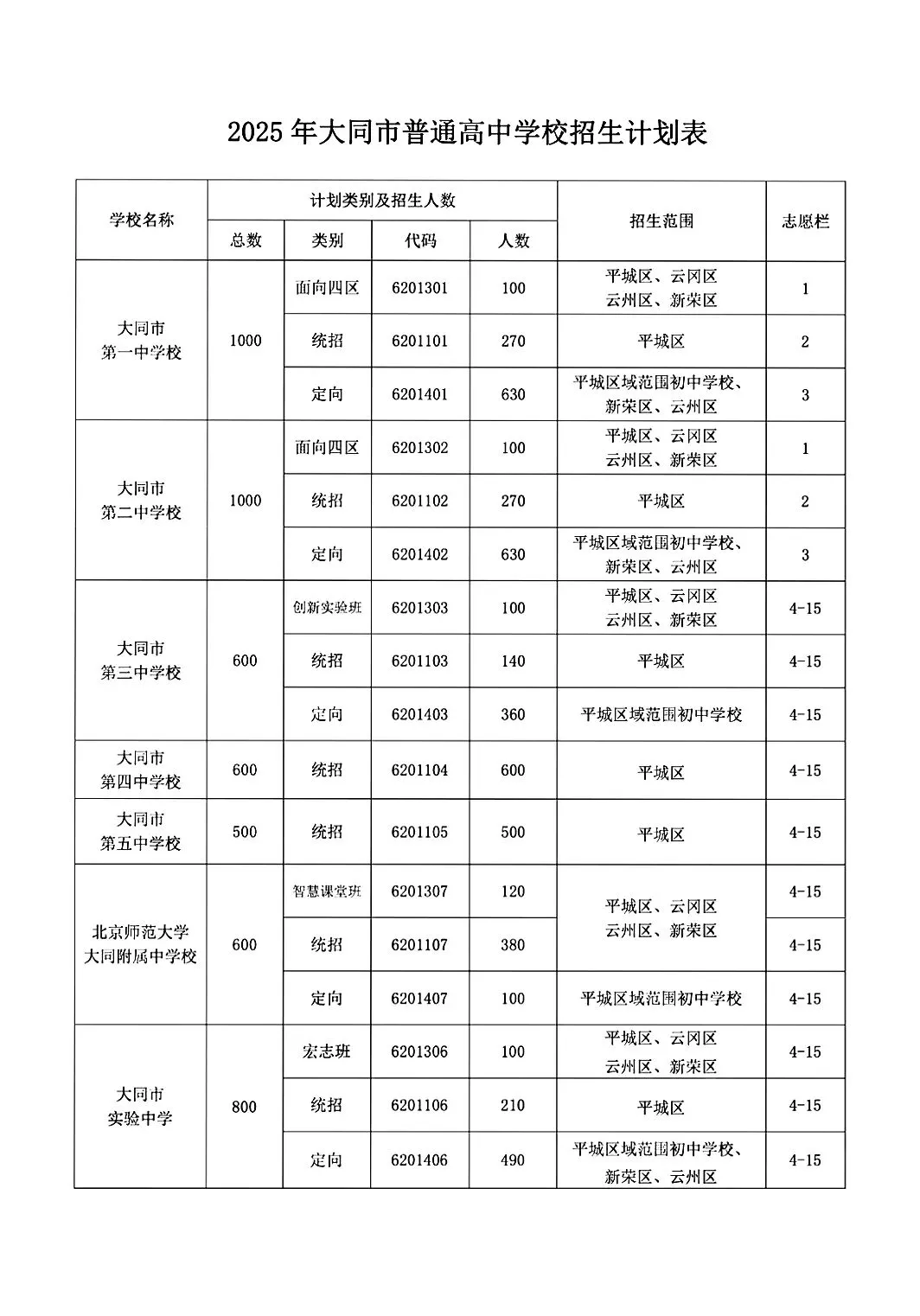 大同一中、大同二中、同煤一中分别从招生计划中划出100名招生指标面向平城区、云冈区、云州区、新荣区招生。