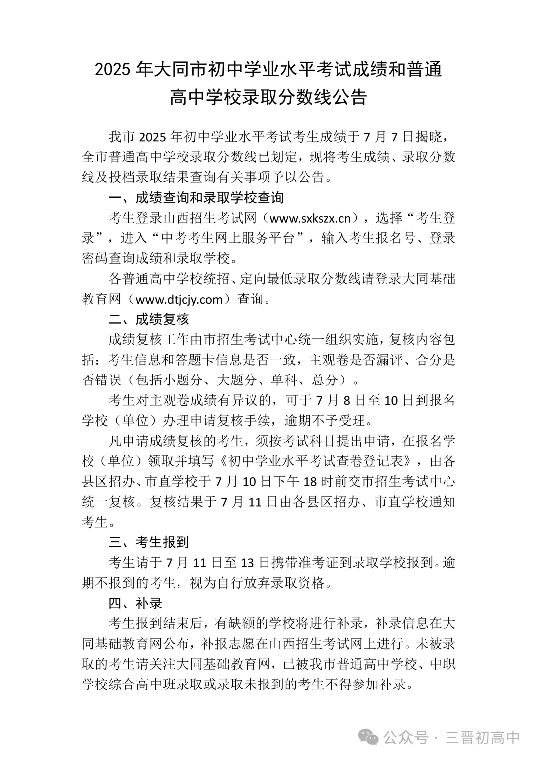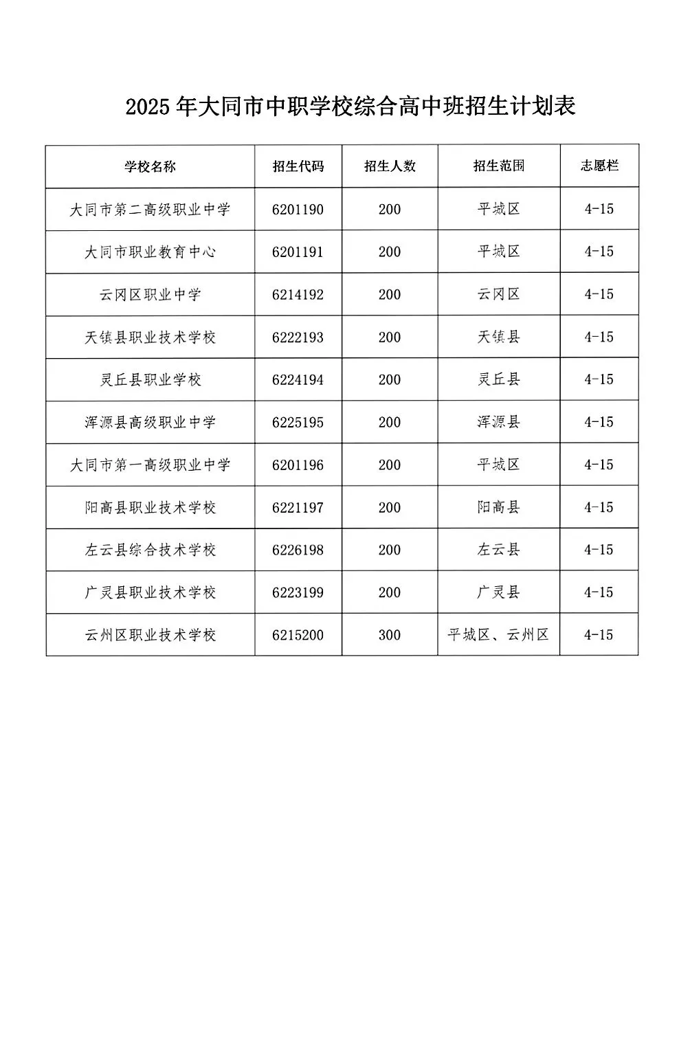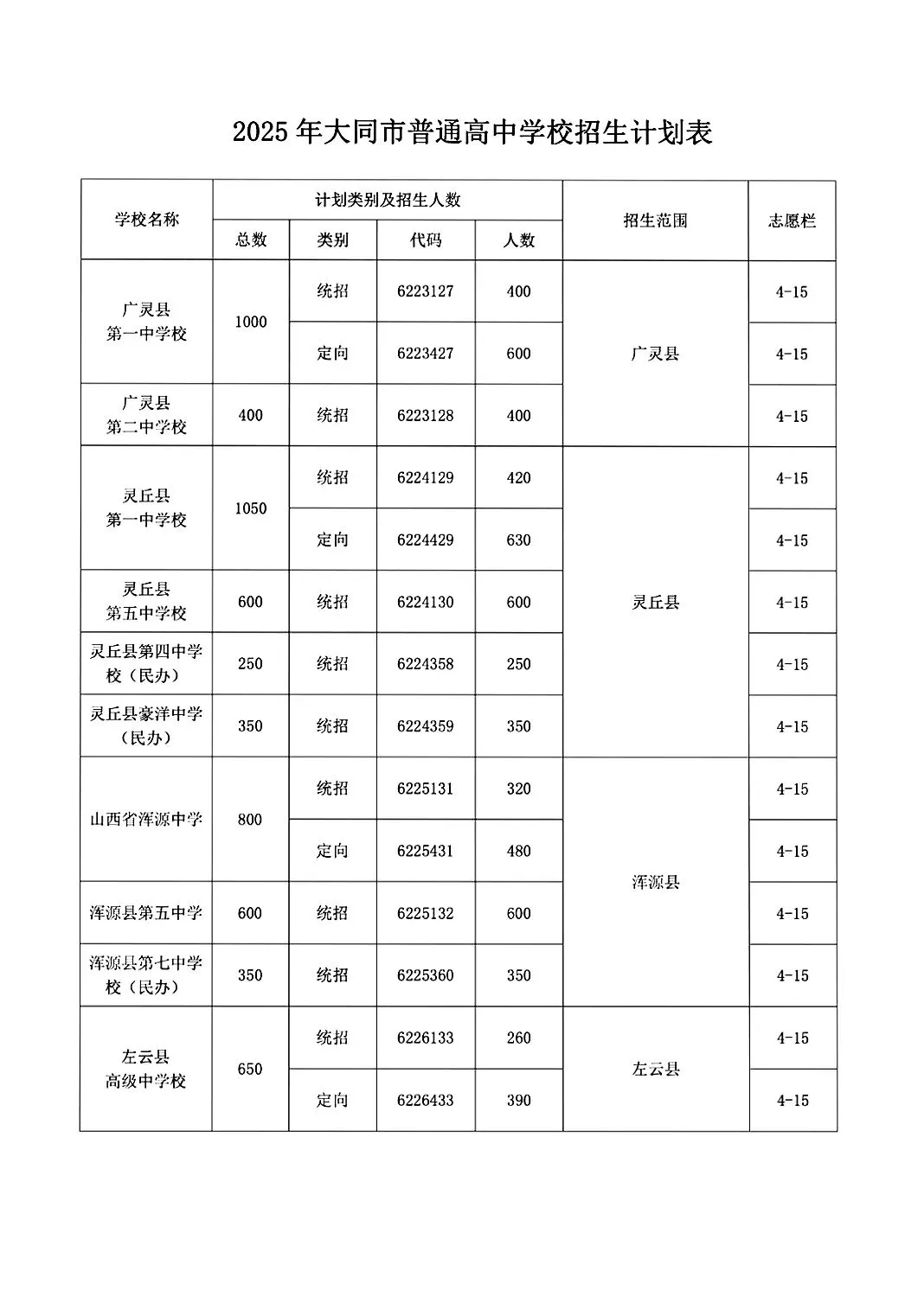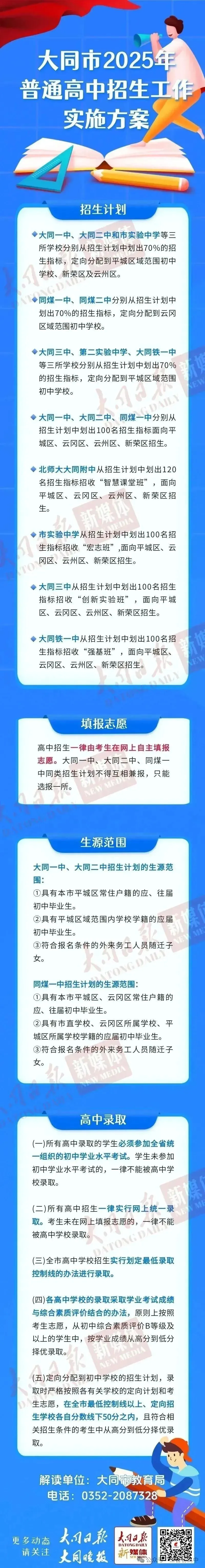 大同一中、大同二中、同煤一中分别从招生计划中划出100名招生指标面向平城区、云冈区、云州区、新荣区招生。