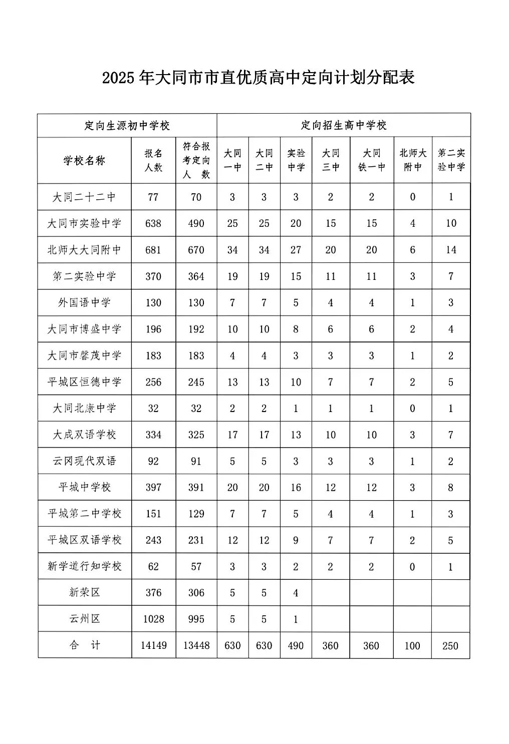 大同三中、第二实验中学、大同铁一中等3所学校分别从招生计划中划出70%的招生指标,定向分配到平城区域范围初中学校。