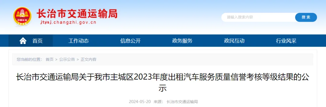 根据交通运输部《出租汽车服务质量信誉考核办法》(交运发[2022]2号)、《关于开展2023年度出租汽车服务质量信誉考核工作的通知》(晋交城客函〔2024〕59号)要求,长治市交通运输局对长治市主城区11家巡游出租汽车企业和家网络预约出租汽车平台按照考核评分及综合评价进行了2023年度服务质量信誉考核。现将考核登记初评结果公示如下: