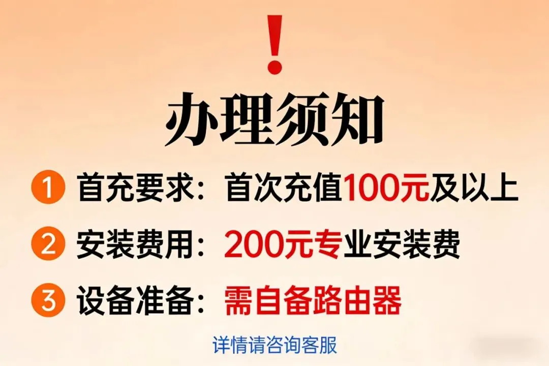 2. 安装相关:需支付200元安装费,工作人员上门专业安装调试,路由器需自行准备;